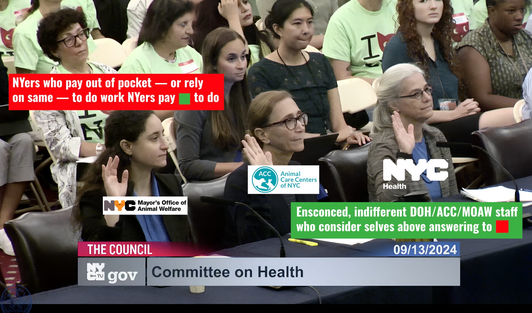 That video still up top is from the only City Council ACC oversight hearing convened by the health committee in years, before or since. The New Yorkers in bright green “I [cat face] NY” shirts work or volunteer for cat rescues that among other duties serve as the city’s trap-neuter-return apparatus. That’s right: After 30 years in operation, and despite its current 34-year, $1.4B no-bid city contract, ACC has yet to initiate a program to manage the homeless cat population for the nation’s largest city.
