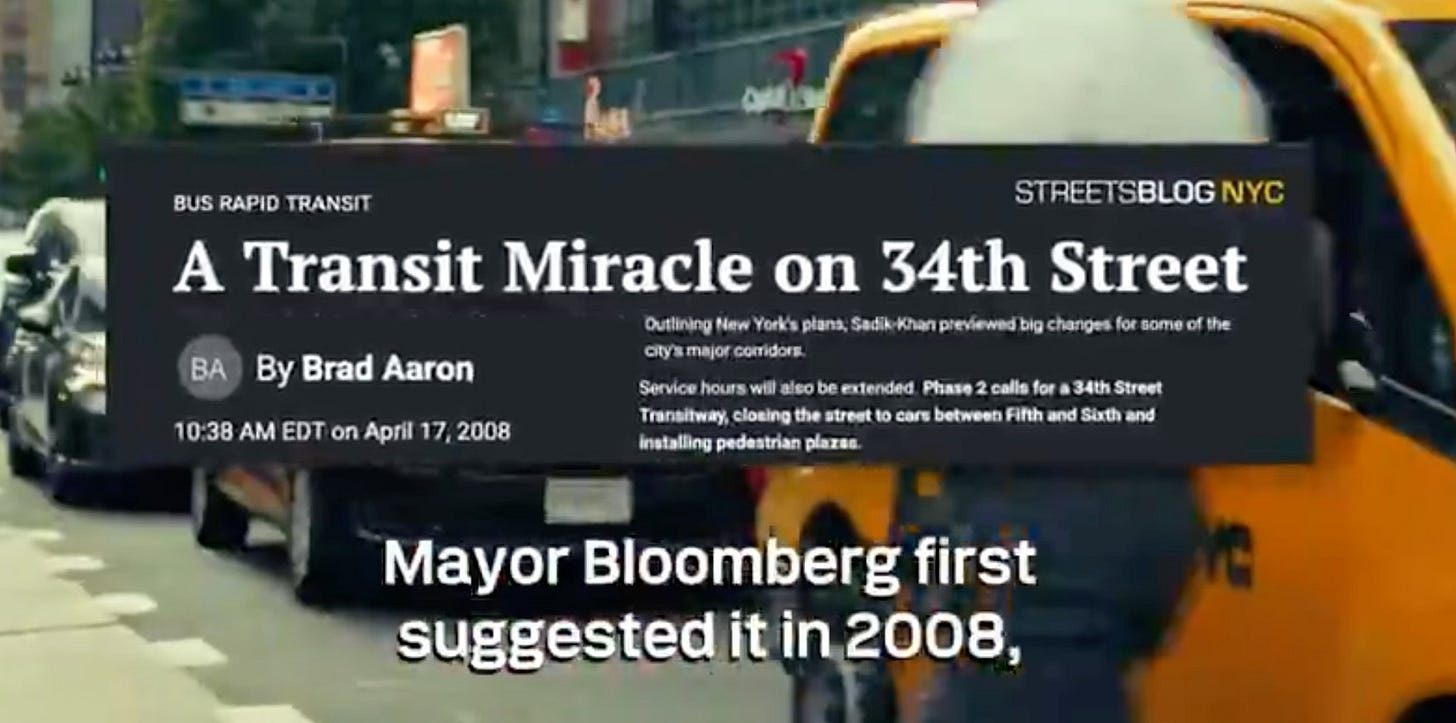 This is a screen grab from one of your campaign ads. I was an editor and reporter at Streetsblog for 11 years. During that time, we helped the city get stuff done — projects including the launch of Citi Bike and pedestrianizing Times Square. We were also the only publication in the city to unequivocally (and aggressively) endorse congestion pricing back in the aughts, before Speaker Sheldon Silver and Assembly Democrats spiked it.