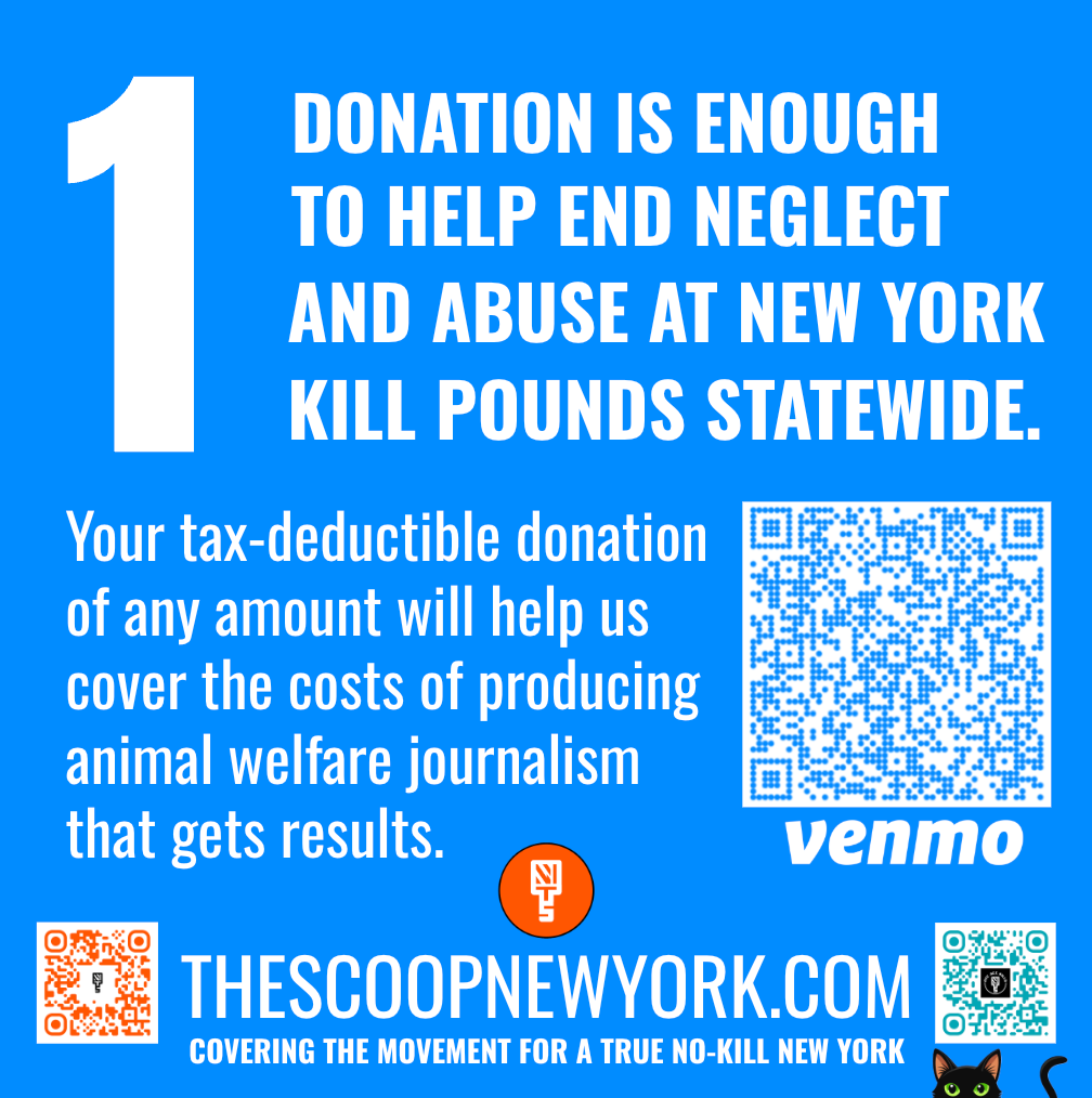 The Scoop New York is a website and newsletter covering the movement for a true no-kill New York State, from BUF to BK. NYC ACC KILLS, published by TSNY, enumerates and memorializes adoptable cats and dogs who were exterminated by Animal Care Centers of New York City.