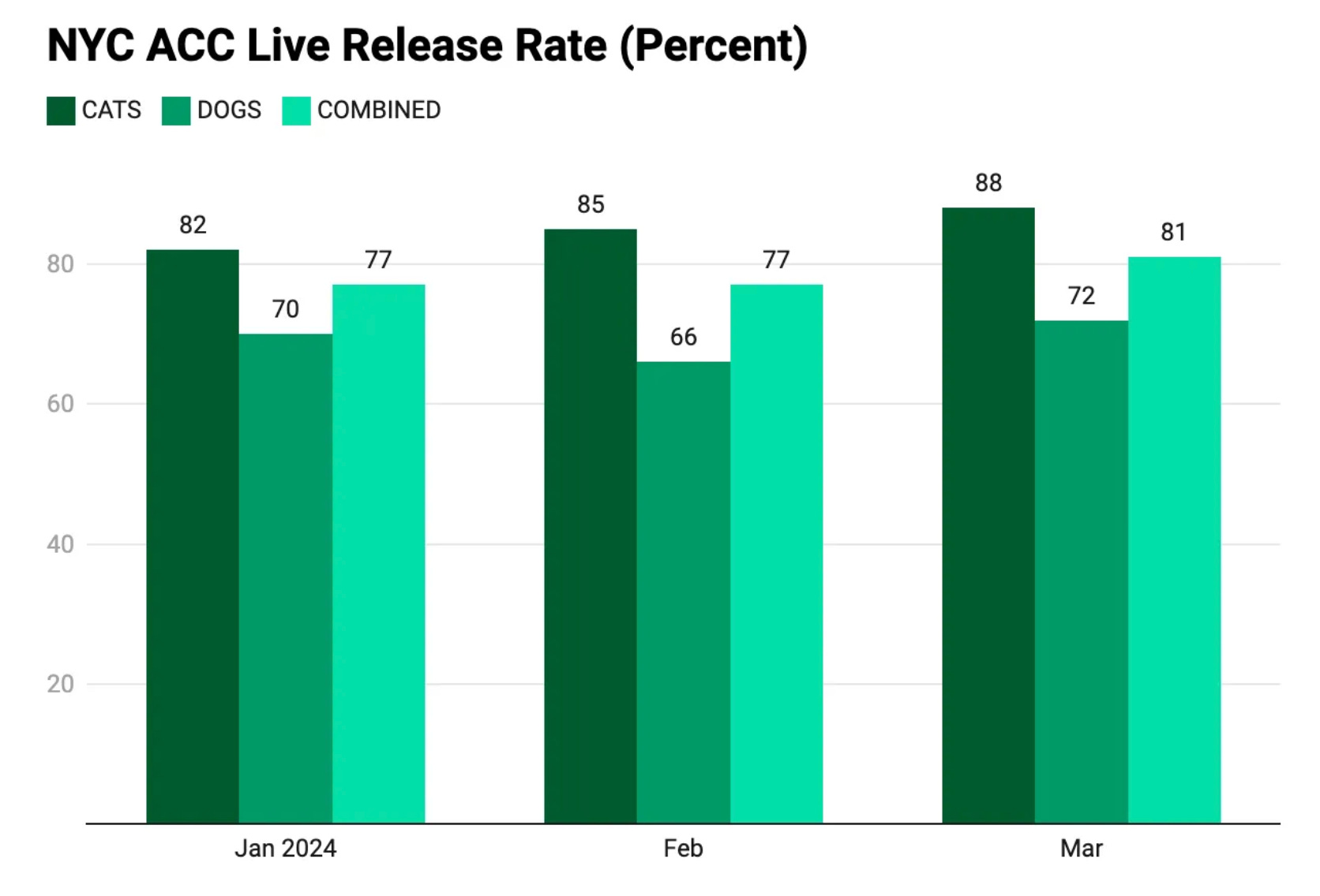 In the first quarter of 2024, ACC’s average combined live release rate (the percentage of animals who make it out alive) for cats and dogs was a dismal 78 percent — same as the rate for all of 2023, though ACC is to this point taking in fewer cats and dogs, in an average month, than last year.