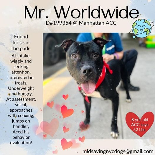 Though there is an established rescue in the Bronx that works with pit bulls, it was determined that the dog should instead be taken to NYC ACC, Norwood News reported. ACC deemed him to be eight years old, and named him Mr. Worldwide.