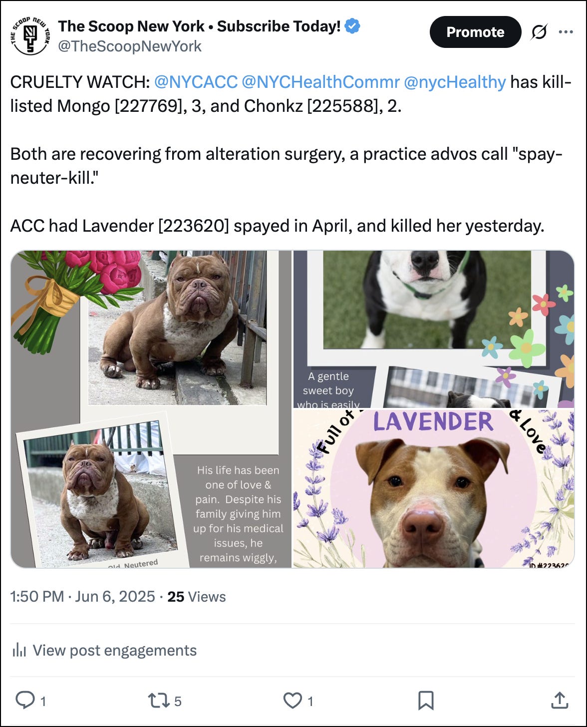 Which is why, at publication time, New Yorkers were desperately trying to save 3-year-old Mongo and 2-year-old Chonkz from the ACC death chamber. Both dogs are currently recovering from alteration surgery, and both are scheduled to be put to death tomorrow — a common ACC practice advocates call “spay-neuter-kill.”