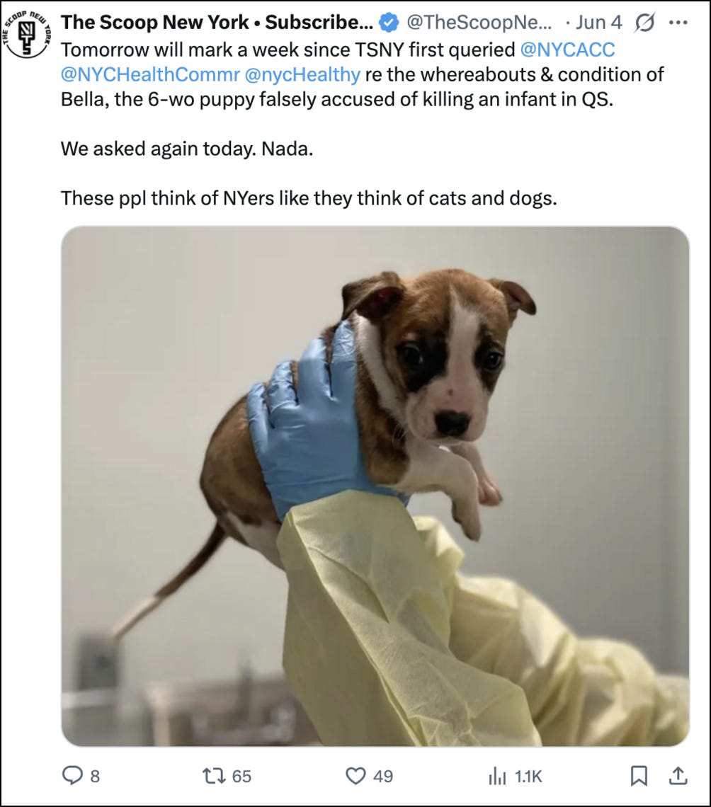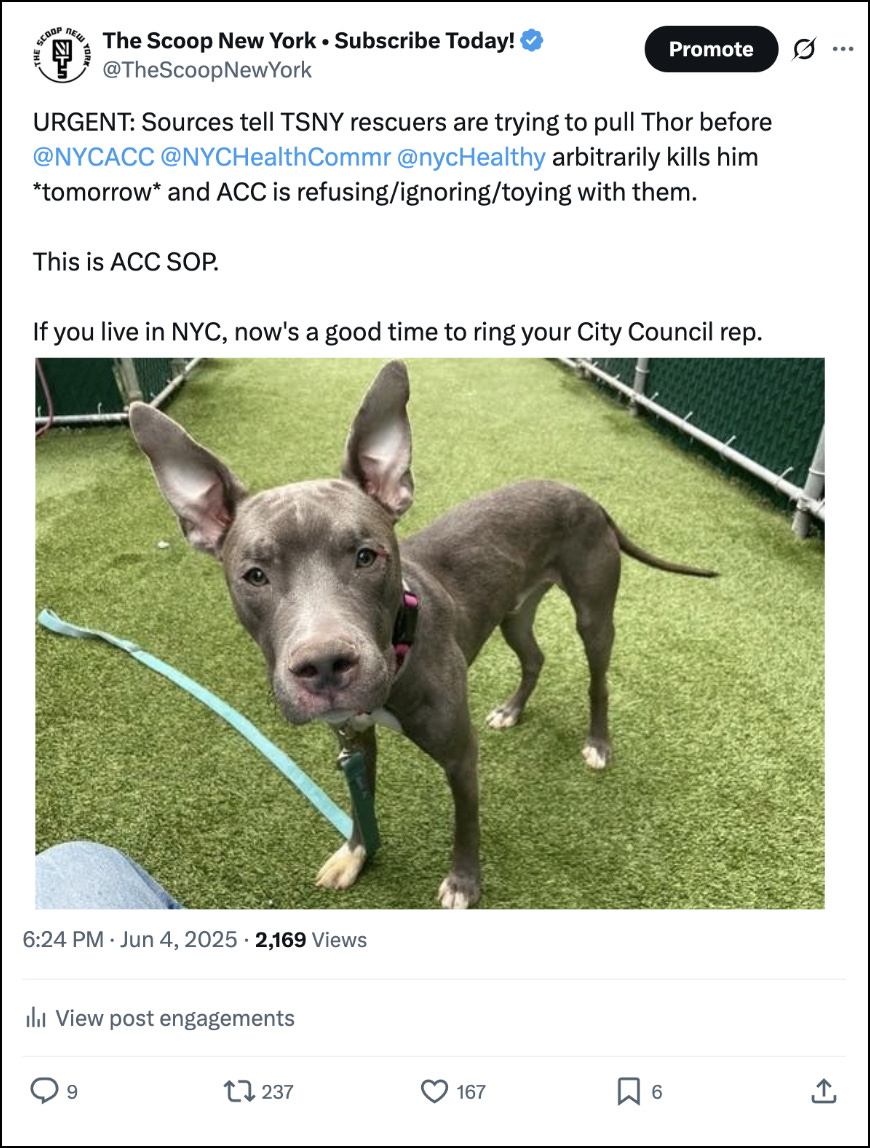 On Wednesday, The Scoop New York asked the DOH acting commissioner, Dr. Michelle Morse, if ACC had in fact ignored rescuers’ pleas to pull Thor, and if so, why. We asked Morse if she was aware how common it is for ACC to use New Yorkers’ compassion against them, punishing rescues and everyday citizens for trying to save animals from the kill pound system. We asked how shabby treatment of New Yorkers who advocate for companion animals aligns with ACC’s stated mission.