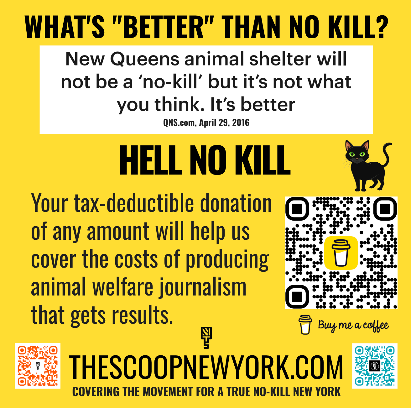The Scoop New York is a newsletter dedicated to companion animals and the New Yorkers who care for them, from Buffalo to Brooklyn. NYC ACC KILLS, published by TSNY, enumerates and memorializes adoptable cats and dogs who were nonetheless exterminated by Animal Care Centers of New York City.