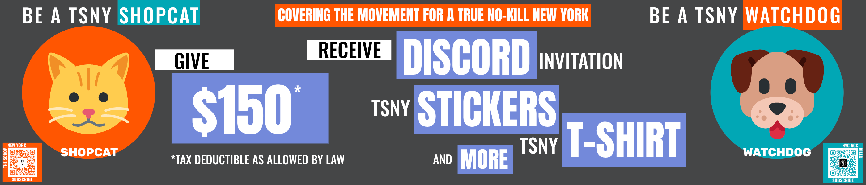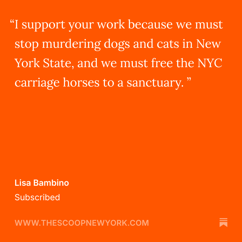 Shopcat & Watchdog-tier subscribers, as well as donors who contribute $150 or more to The Scoop New York or NYC ACC KILLS, may have their names included here on the TSNY Patrons page.