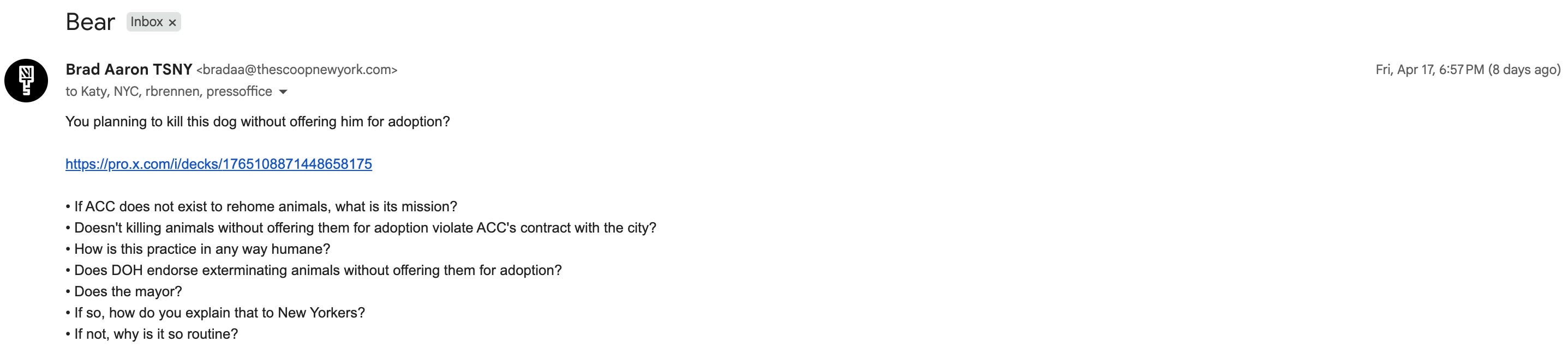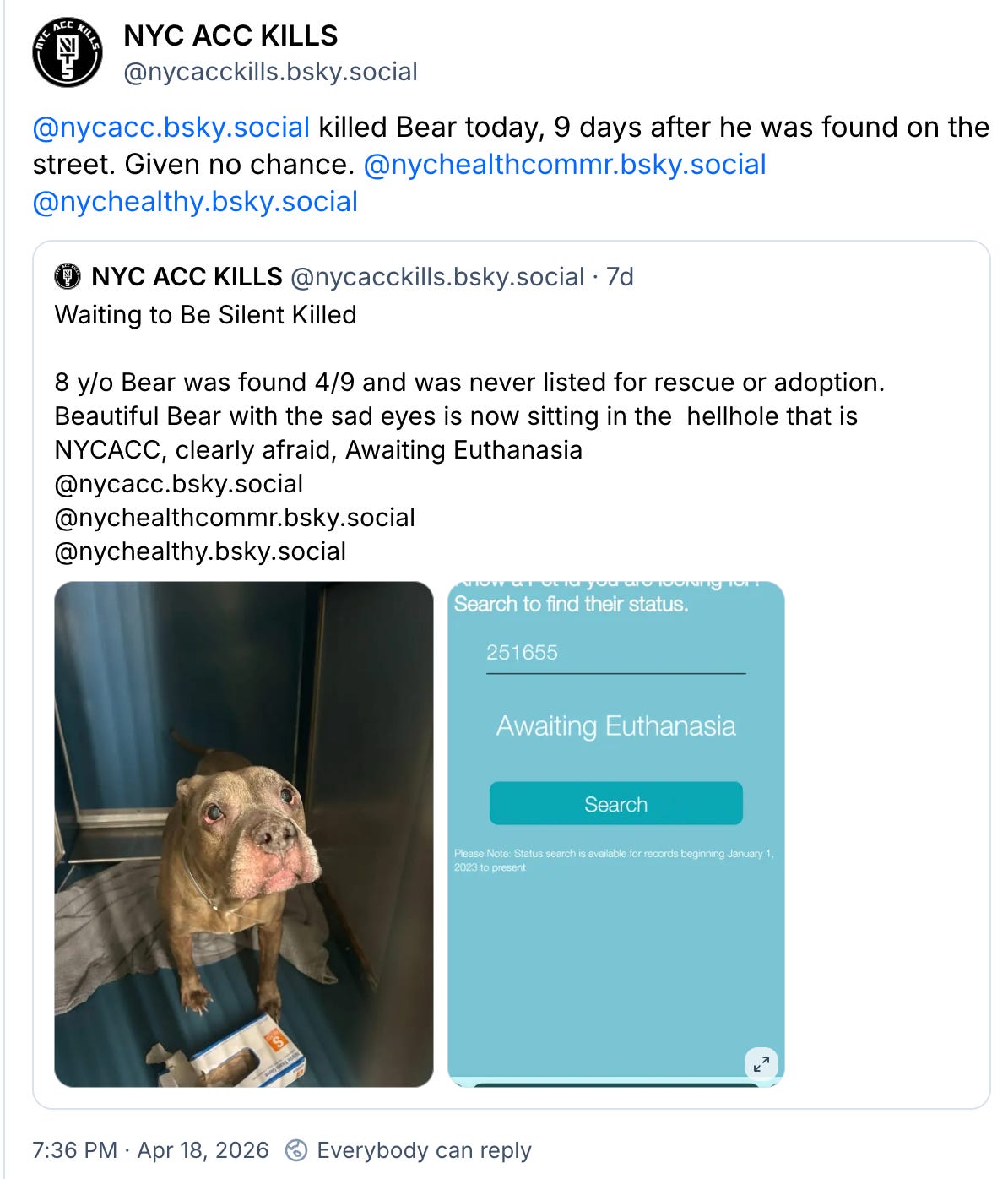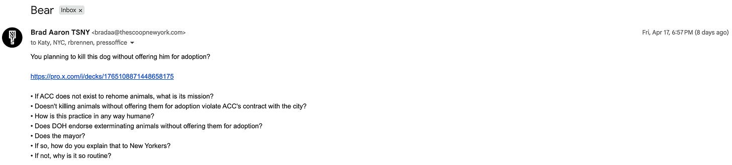 In addition to victims DOH/ACC drags to their deaths in view of New Yorkers and others around the country (and the planet) trying desperately to save them, The Weekly Carnage and the Death Row Show will devote much time calling attention to victims like Bear.