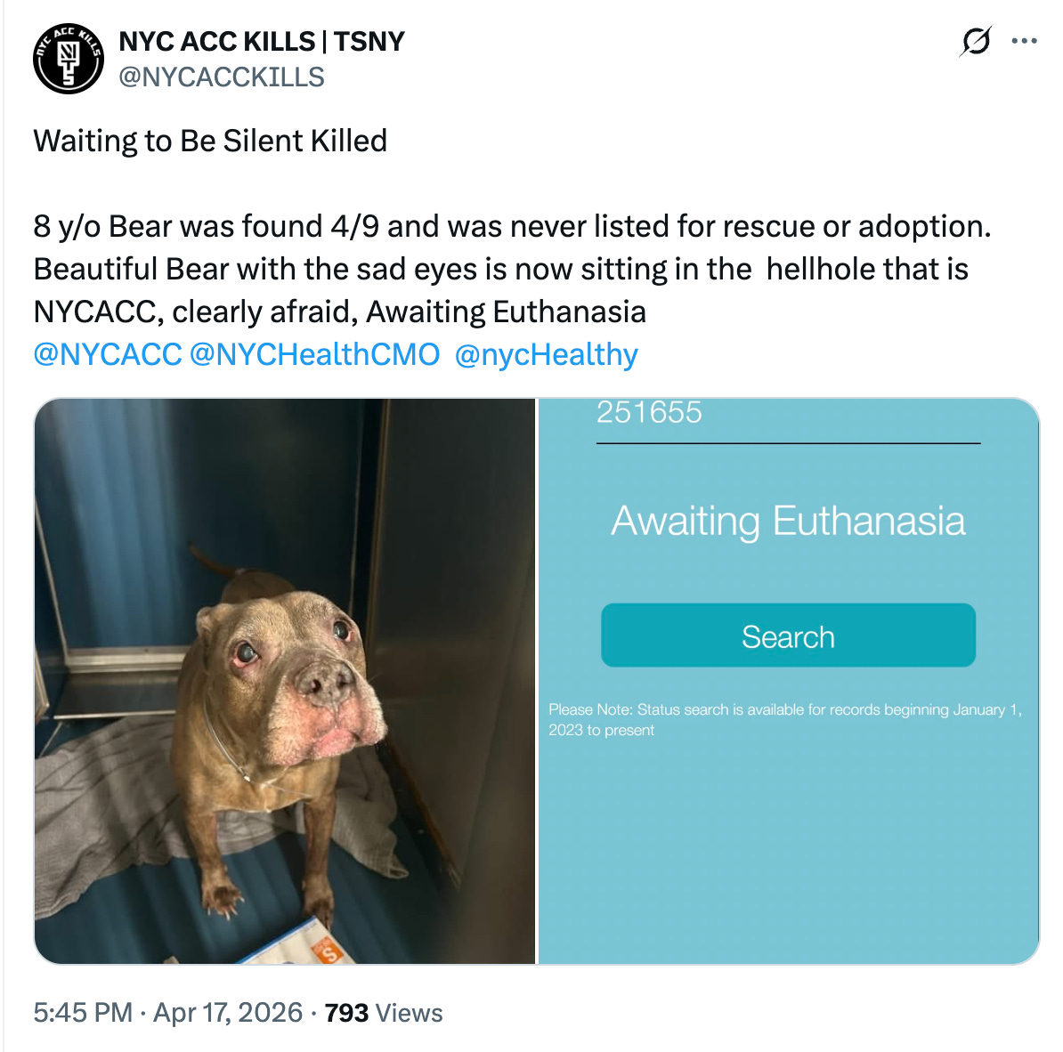 So poor dogs like Bear, age 8, found abandoned and exterminated nine days later, are killed without ever being offered for adoption. Ditto Drifter, 6, who went from a bite hold “straight to kill command.” Grizzly, who had renal disease and was exterminated on day three. And Tinkerbell — a year-old puppy, who might just be DOH/ACC/Mamdani’s favorite targets — of whom a volunteer said, “All she wanted was to be close to me, pressing her head into my body and leaning her whole weight against me for comfort.”