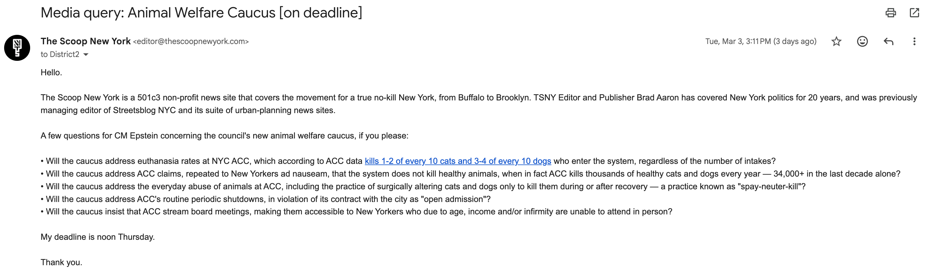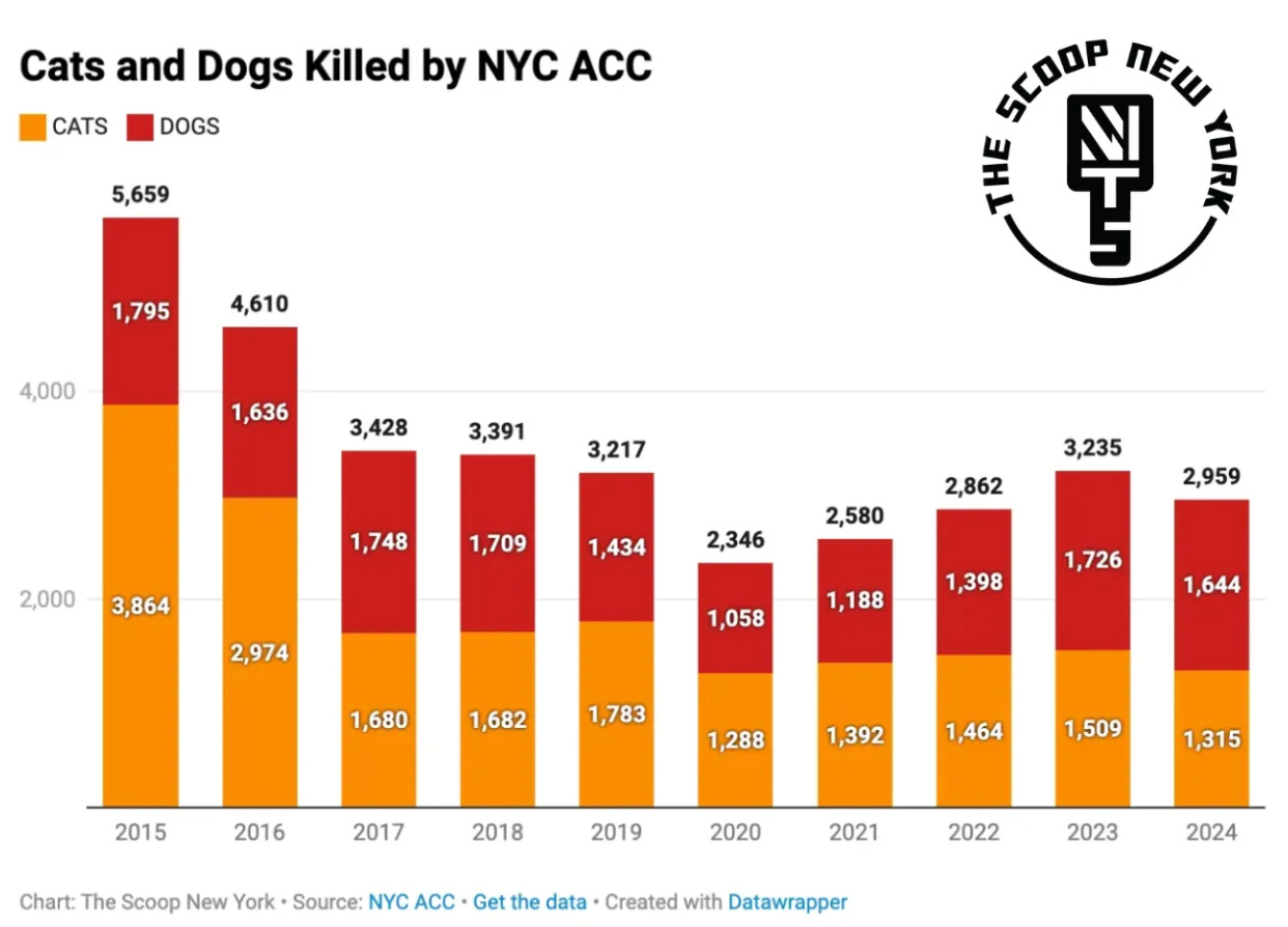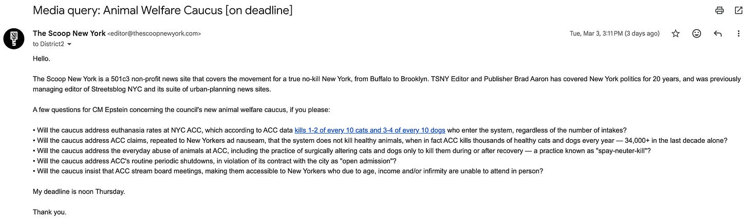 Epstein and Menin are running the playbook now — the caucus already appears on Epstein’s Wikipedia page — as accomplices like VFAR and ASPCA and HSUS, alongside credulous news outlets like AMNY, amplify the lie. Said lie being that you can be a Friend Of The Animals while willfully ignoring what is by far the biggest threat to vulnerable cats and dogs in the city’s history: the city itself, which torches hundreds of millions in taxpayer dollars, along with the carcasses of tens of thousands of once and/or future family pets, via the always-open death chambers at NYC ACC.