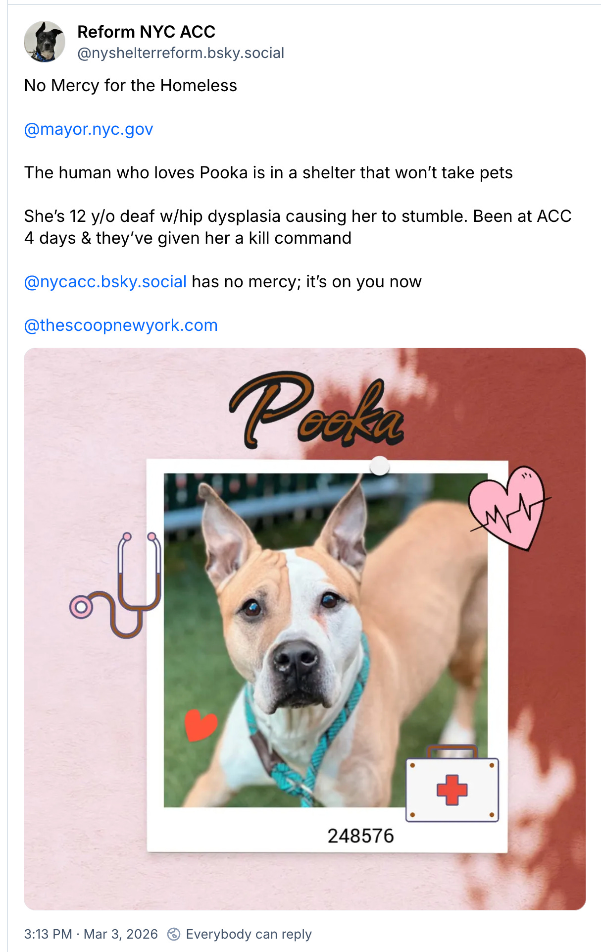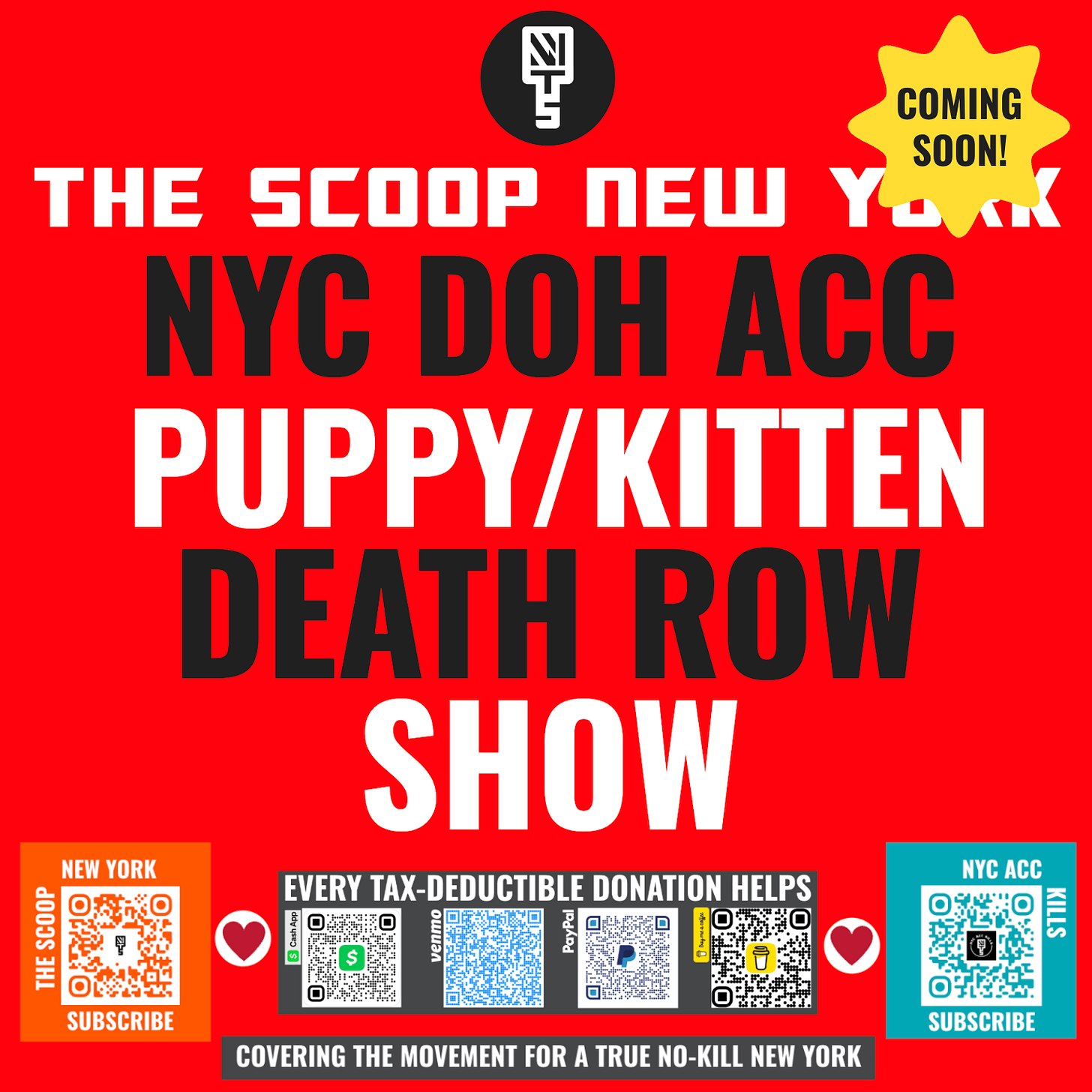 The Scoop New York is a website and newsletter covering the movement for a true no-kill New York State, from BUF to BK. NYC ACC KILLS, published by TSNY, enumerates and memorializes adoptable cats and dogs who were exterminated by Animal Care Centers of New York City.