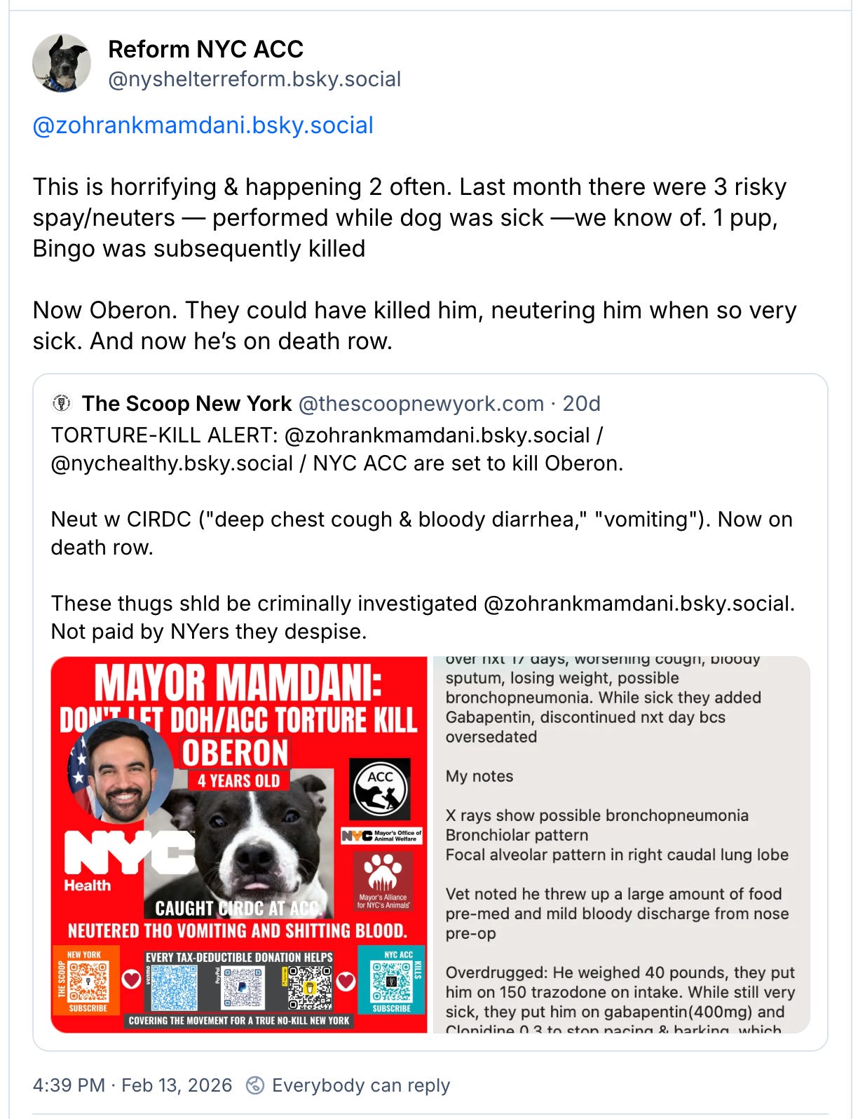 As Epstein — an erstwhile Assembly member like Zohran Mamdani; a purported vegan like Justin Brannan and Eric Adams — pimps poor Simon, here are scenes from ACC death row. Mere snapshots of the day-to-day reality faced by homeless companion animals in the city’s custody, and the sadistic abuse purposely foisted by ACC upon IRL advocates who sacrifice their wallets and waking hours desperately trying to save those animals from extermination, knowing that many of the cats and dogs they have vicariously come to love won’t make it, and watching them vanish into the maw.